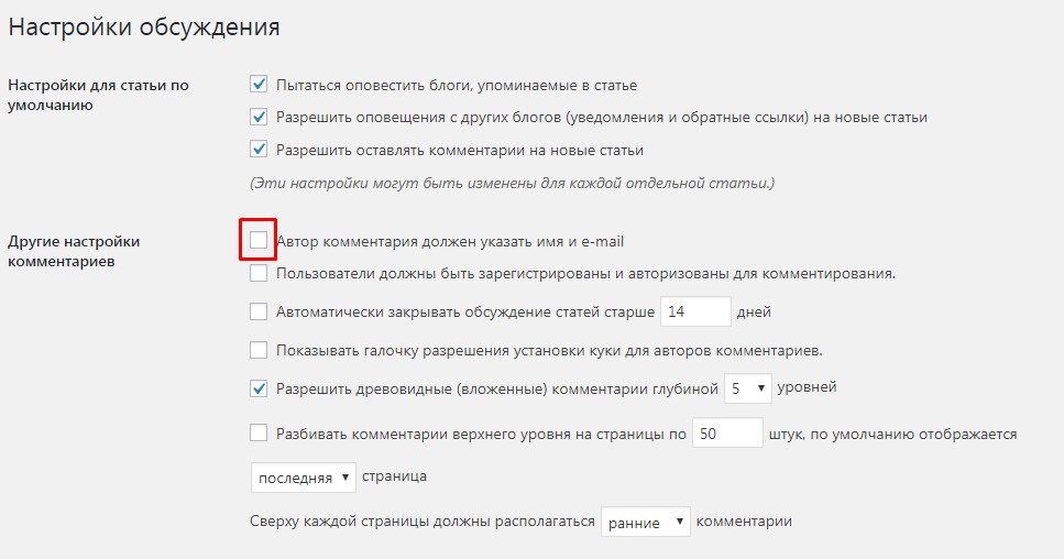 В консоле заходим в Настройки → Обсуждение и убираем галочку с пункта «Автор комментария должен указать имя и e-mail», сохраняем изменения.